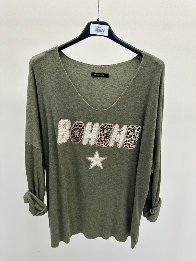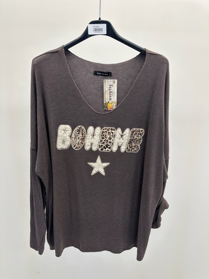 Un esprit libre et tendance s’invite dans votre dressing avec ce pull doux et fluide “Bohème”, parfait pour un look à la fois confortable et stylé. Conçu dans une maille légère au tombé souple, il offre une coupe ample qui met en valeur toutes les silhouettes. L’inscription “BOHÈME” brodée et texturée avec des touches d’imprimé animalier apporte une note originale et chic. Le col V flatte le décolleté et les manches retroussables donnent une allure décontractée.