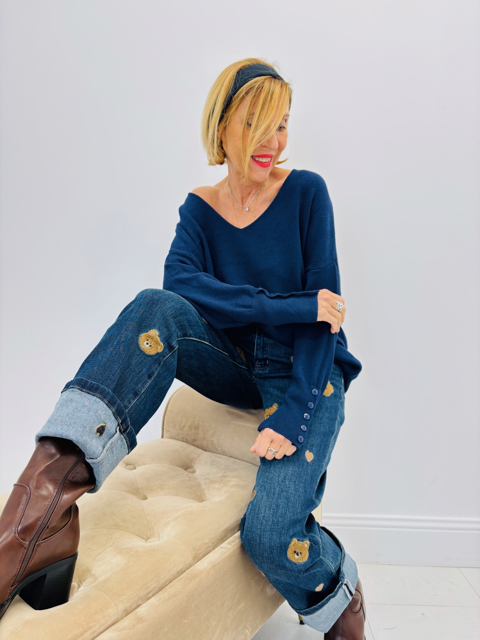 Ce pull se porte aussi bien épaules dégagées pour un effet décontracté que classique pour un rendu plus chic. Associez-le à un jean brodé, des bottines et un bandeau pour un look automne doux et féminin — comme sur nos photos.