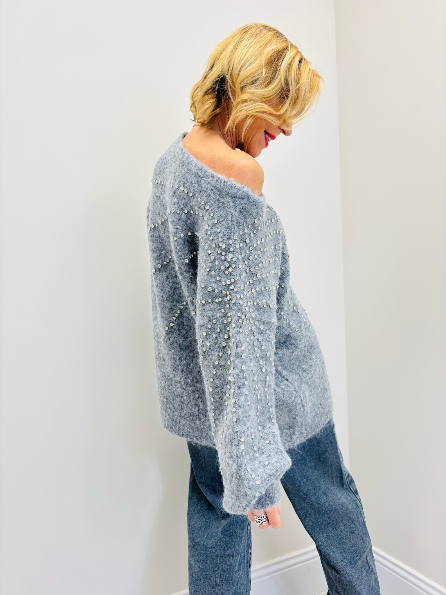 Le modèle LIV se distingue par son effet mohair vaporeux et ses gros strass disposés en diagonale sur le devant et les manches, pour un rendu à la fois moderne et lumineux.