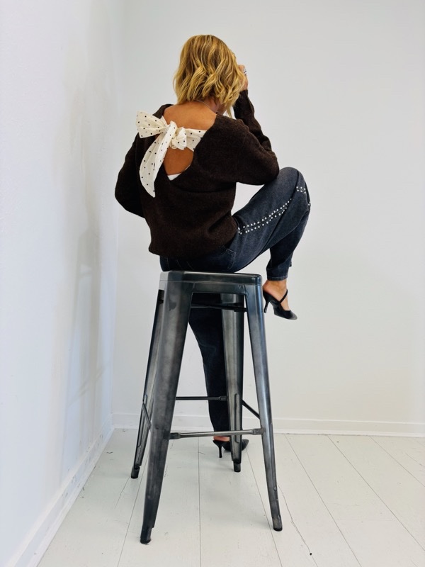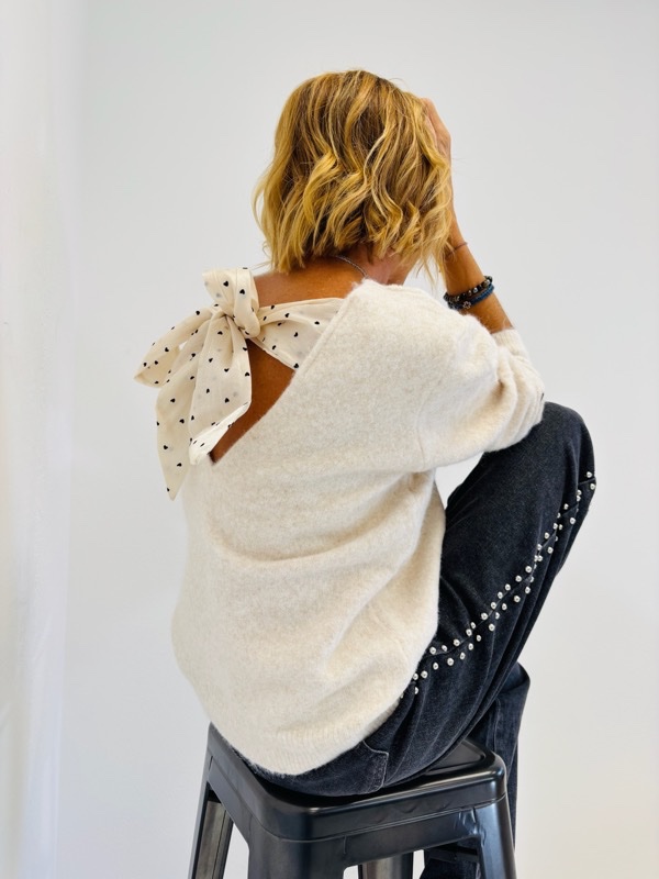 Dos en V élégant, orné d’un grand nœud contrasté à pois, pour une touche féminine et originale.