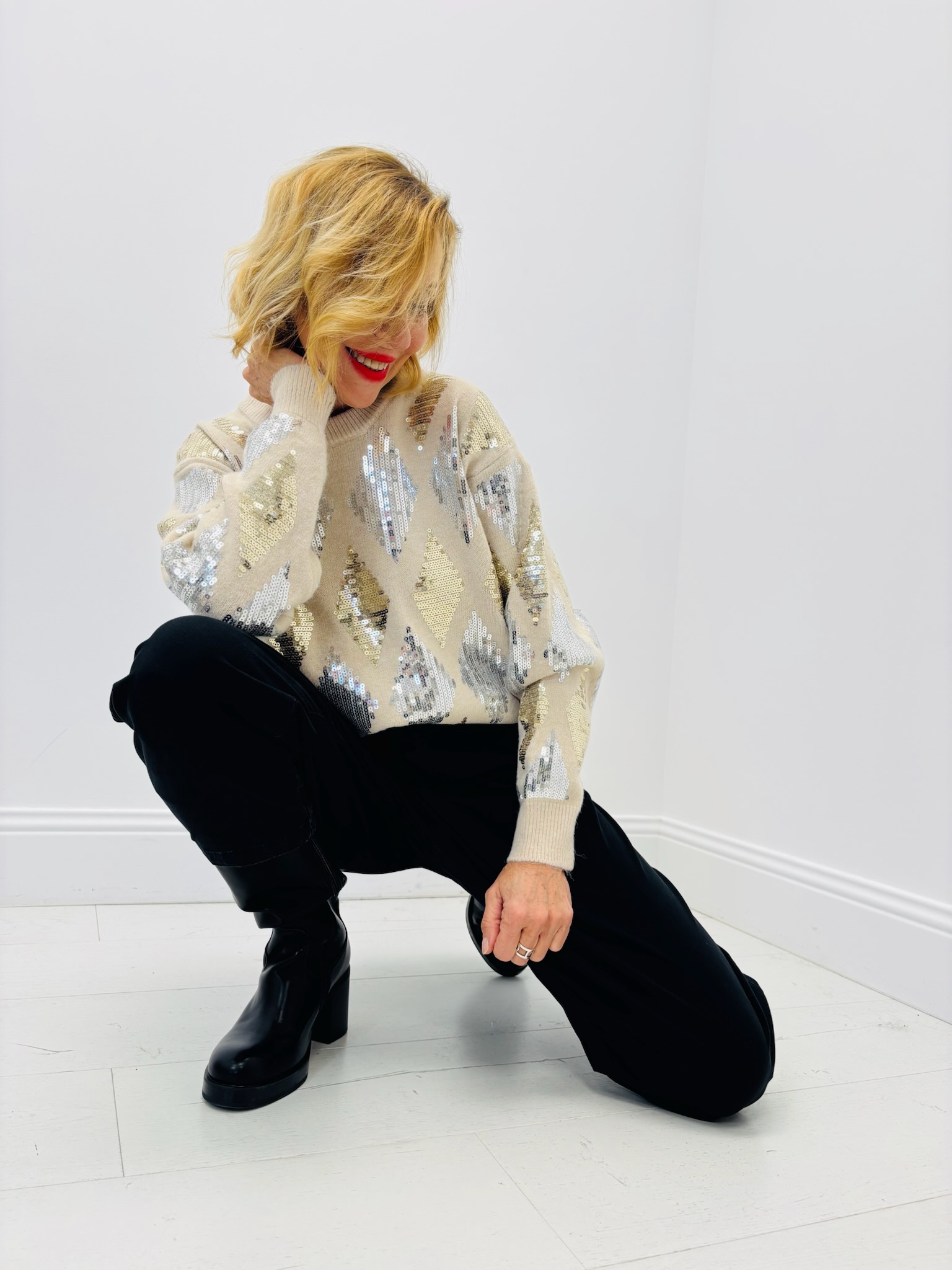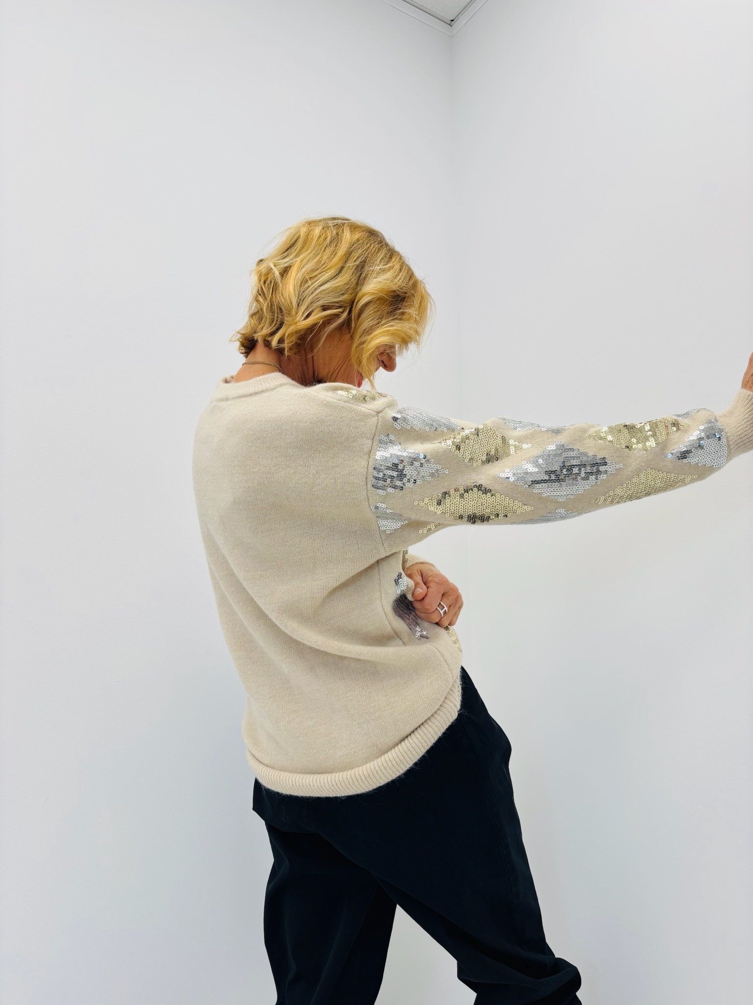 Ce pull illumine la saison avec ses reflets scintillants et son motif losange entièrement rebrodé de sequins argentés et dorés.