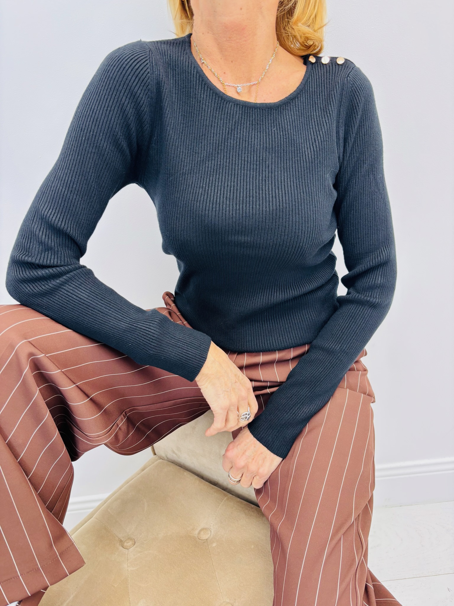 Le détail qui fait la différence : les petits boutons décoratifs sur l’épaule, apportant une touche élégante et moderne.