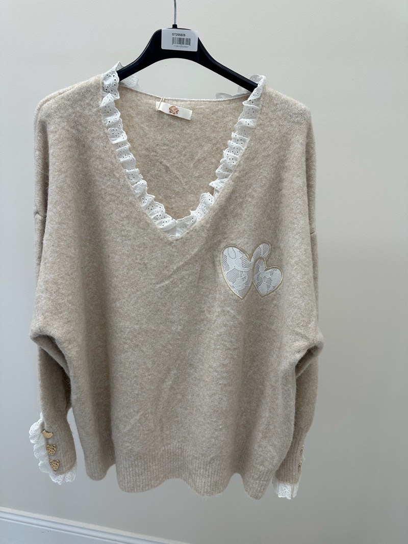 Pull grande taille beige avec dentelle et cœurs brodés – Élégance douce et féminine