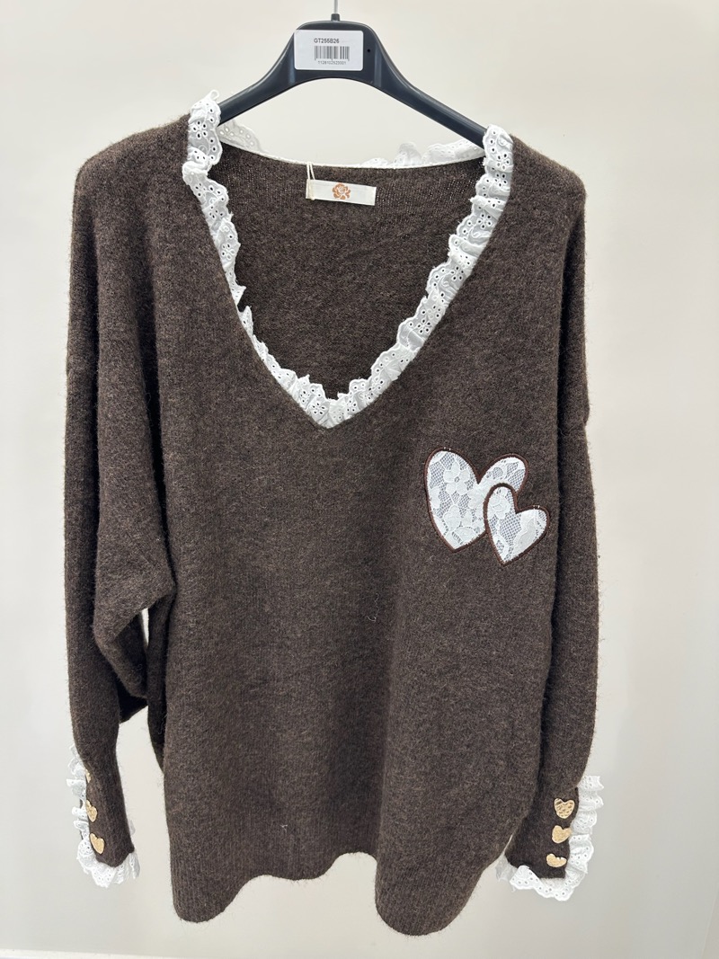 Ce pull grande taille mise sur la délicatesse des détails pour un look à la fois romantique et raffiné. Confectionné dans une maille duveteuse ultra-douce, il séduit par son col V orné d’une fine dentelle blanche et son motif double cœur délicatement brodé sur la poitrine.