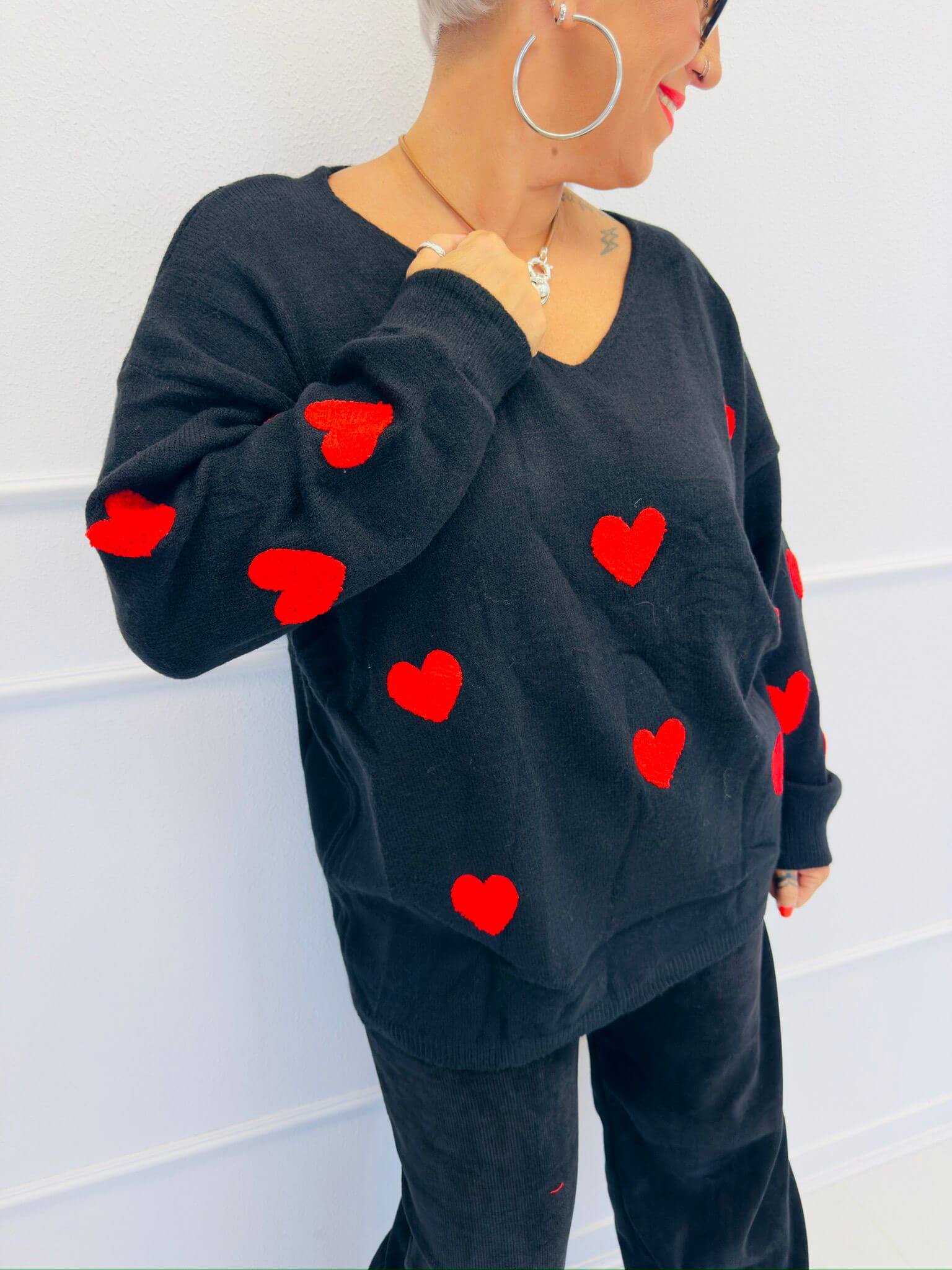 Pull ample à encolure en V, décoré de motifs cœurs en all-over pour une touche féminine et tendance. Confortable et doux, il se porte facilement au quotidien et apporte une note de fantaisie à vos tenues. Sa coupe fluide et décontractée convient parfaitement aux silhouettes grande taille, offrant liberté de mouvement et style assuré