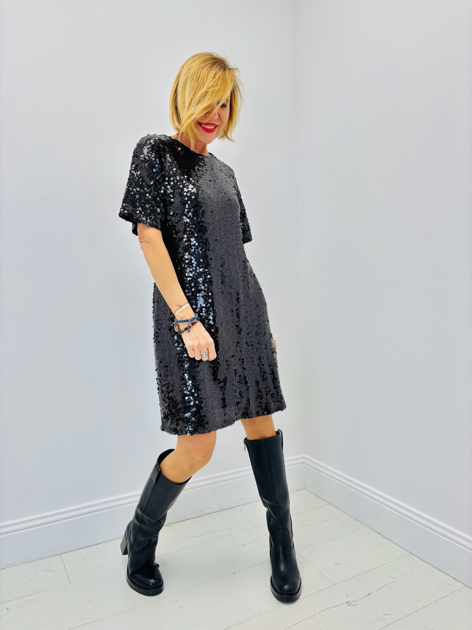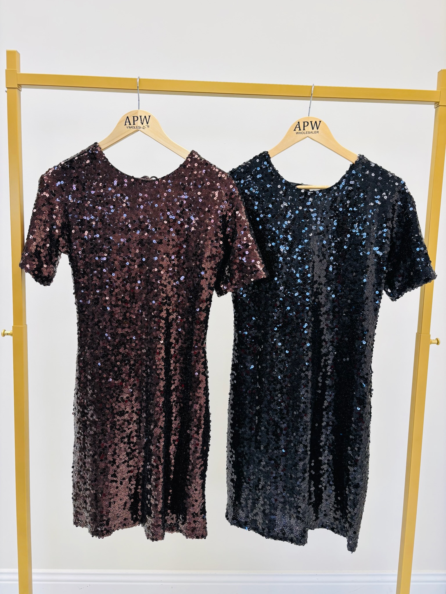 Cette robe entièrement recouverte de sequins est la pièce parfaite pour briller lors des fêtes, soirées et événements spéciaux. Son tombé fluide et sa coupe droite offrent une silhouette élégante sans effort, tandis que sa doublure intégrale assure un confort optimal malgré l’effet scintillant.