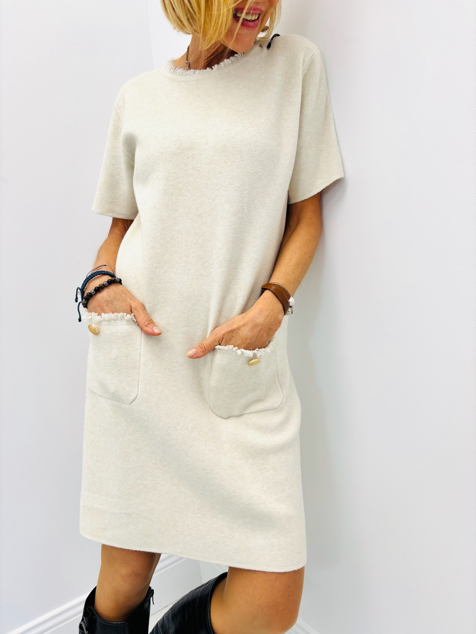 Chic, douce et facile à porter, cette robe droite VALENTYNE est un essentiel du dressing féminin. Sa coupe simple met en valeur la silhouette sans la marquer, tandis que les détails frangés et boutons dorés sur les poches apportent une touche sophistiquée et lumineuse.