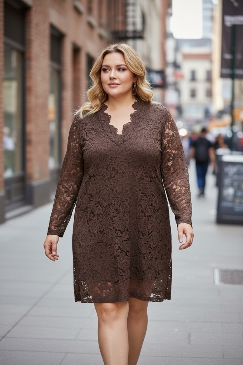 Cette robe en dentelle chocolat grande taille allie finesse et raffinement dans une coupe fluide et flatteuse.