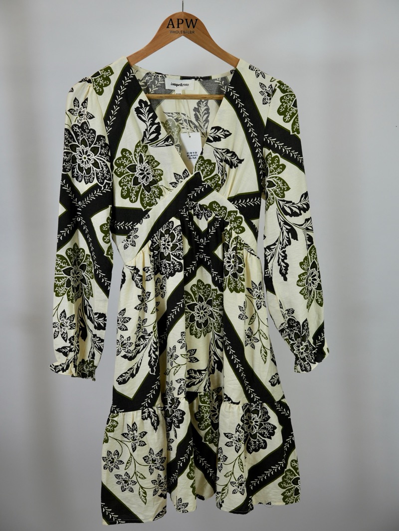 Son imprimé floral aux tons verts et noirs sur fond écru lui confère un style à la fois chic et naturel — parfait pour la mi-saison.