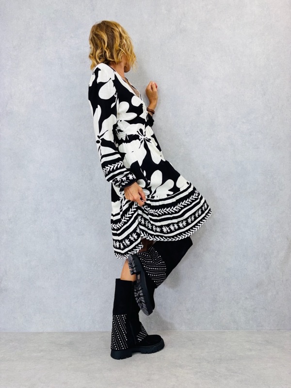 Élégante et fluide, cette robe en viscose séduit par son grand imprimé floral contrasté qui lui donne du caractère. Sa coupe évasée met en valeur la silhouette, tandis que le décolleté en V et la taille légèrement froncée ajoutent une touche féminine.