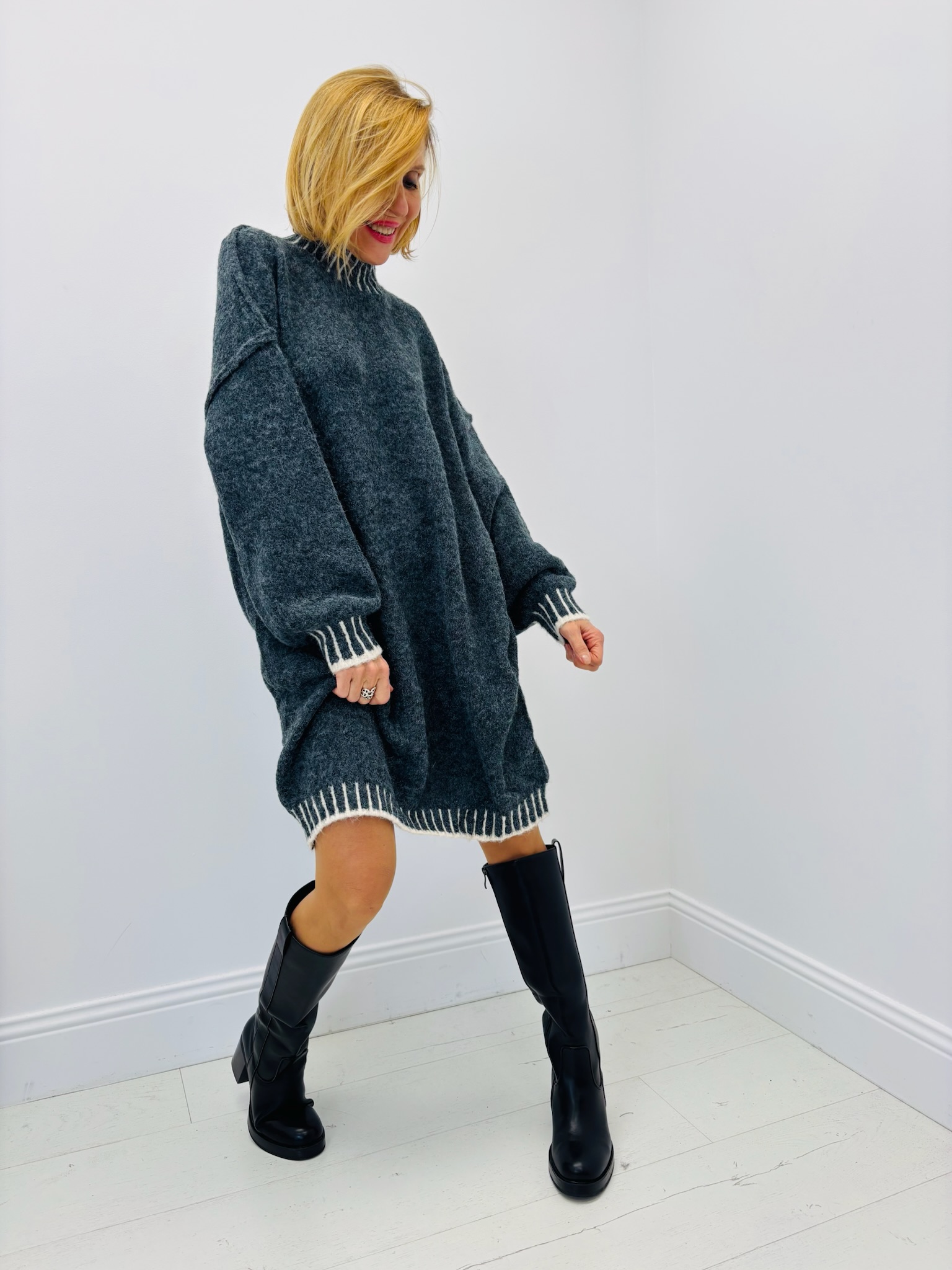 Disponible en gris chiné et en noir, cette robe pull peut se porter aussi bien en tenue décontractée qu’en version plus habillée avec des bottes hautes comme sur la photo. Elle offre un tombé souple et chaleureux, idéal pour les journées froides.
