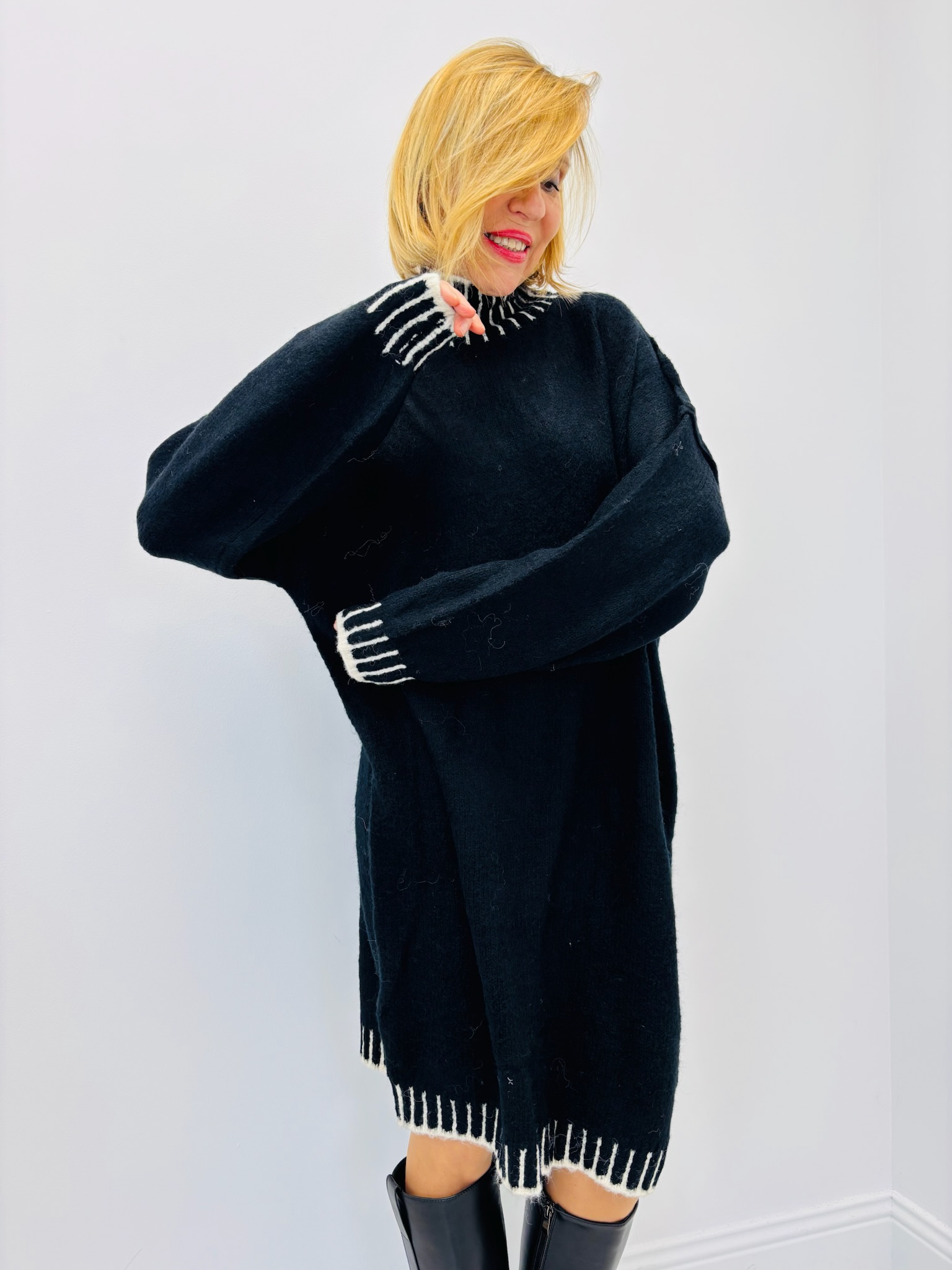 Le col montant, décoré de rayures contrastées, apporte une touche graphique chic, que l’on retrouve également sur les poignets et le bas de la robe.
