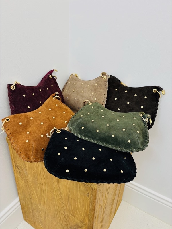 Un sac chic et tendance, confectionné en cuir de vachette véritable. Son design en suédine rehaussé de petits clous dorés lui apporte une touche élégante et moderne.