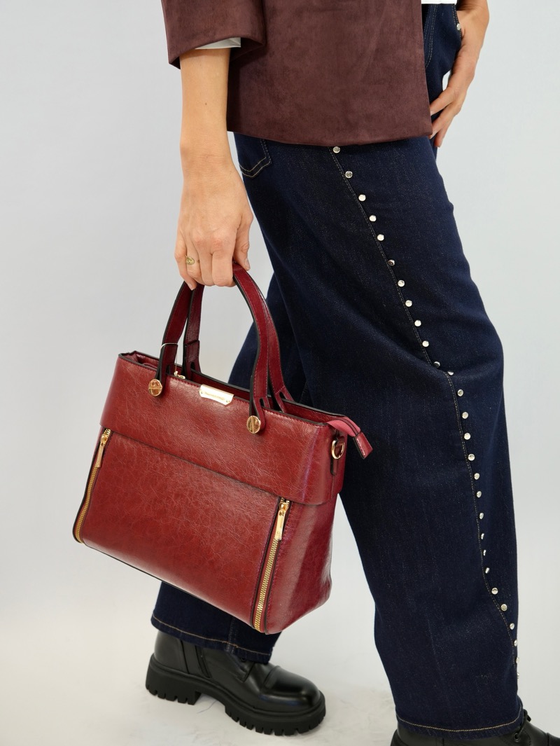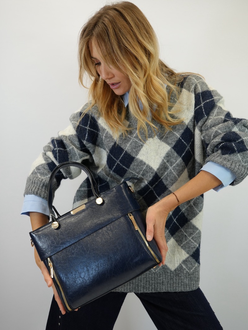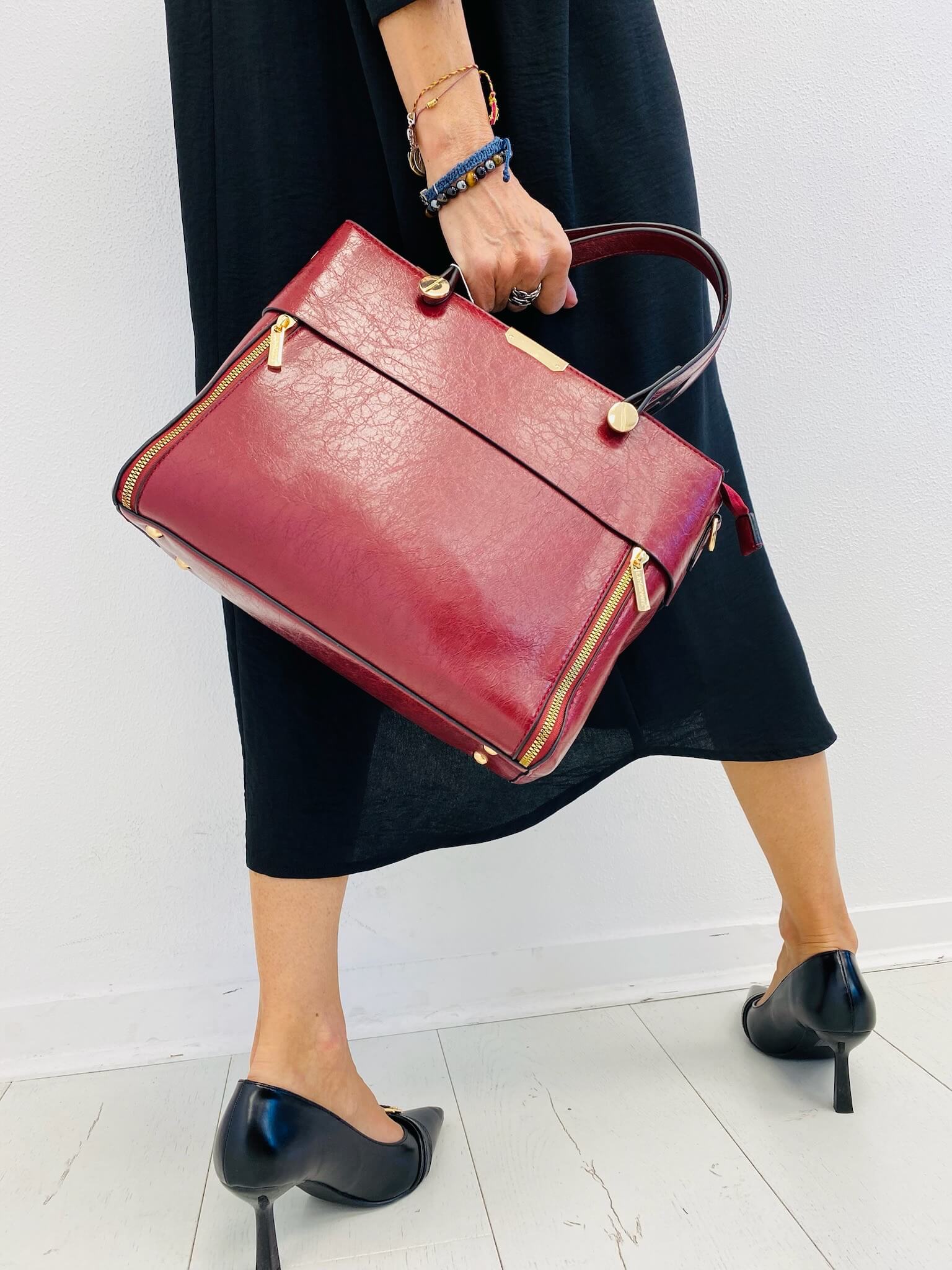 Ce sac structuré séduit par son design élégant et ses lignes épurées. Sa matière rigide assure une belle tenue tout au long de la journée. Il est agrémenté de deux fermetures zippées verticales sur les côtés, d’une fermeture principale à zip et de poignées arrondies confortables. Les finitions métalliques dorées apportent une touche de sophistication. Pratique et spacieux, il s’adapte aussi bien à une tenue habillée qu’à un look professionnel. Porté main ou épaule grâce à sa bandoulière amovible.