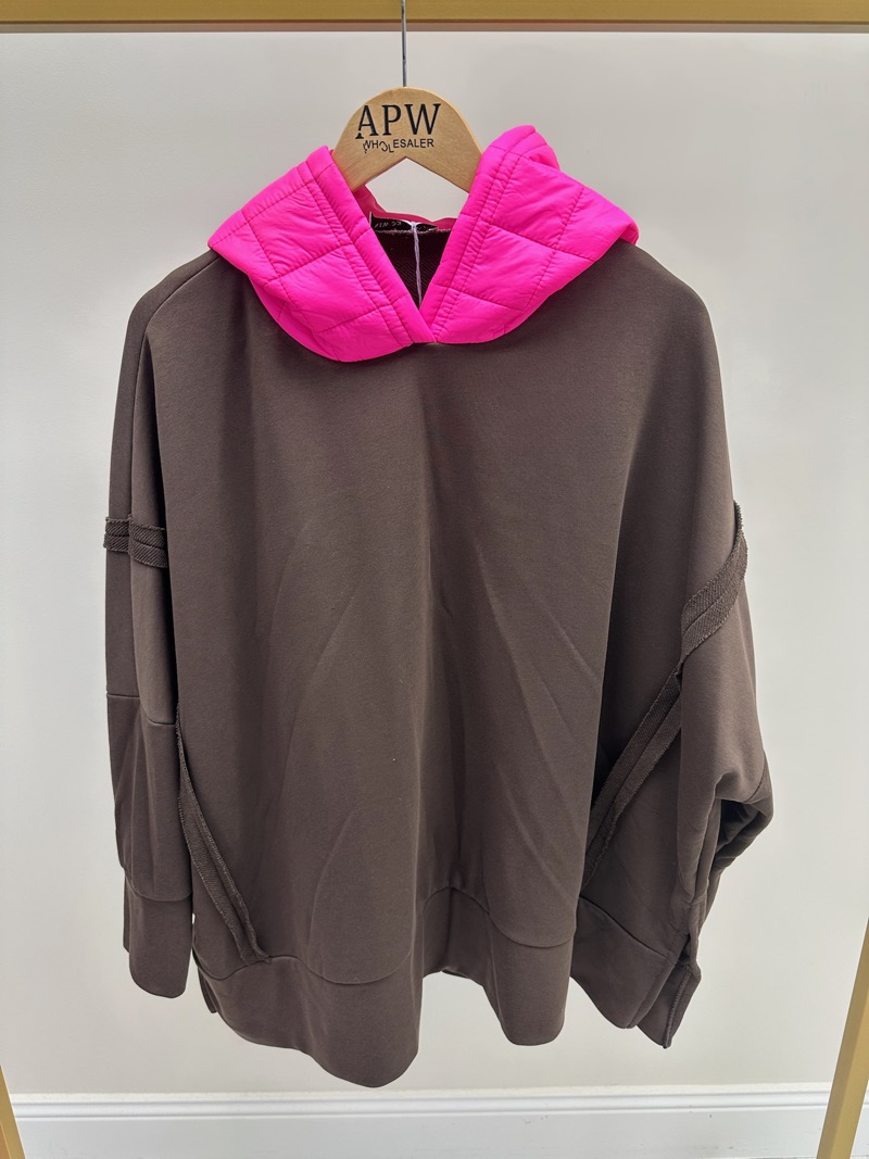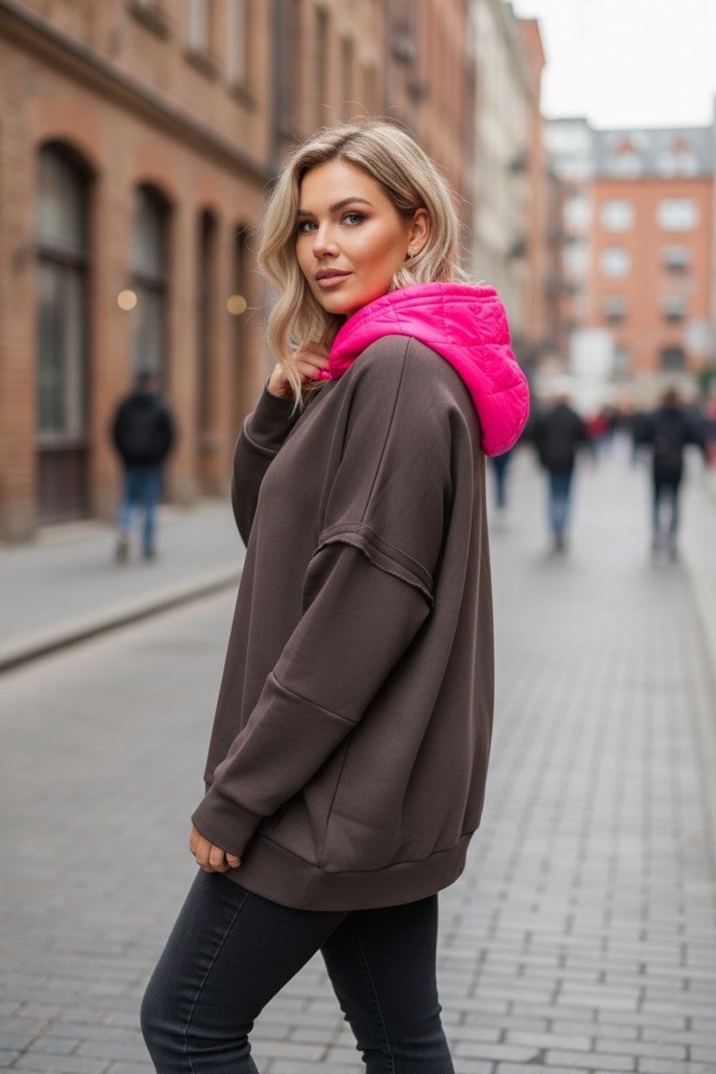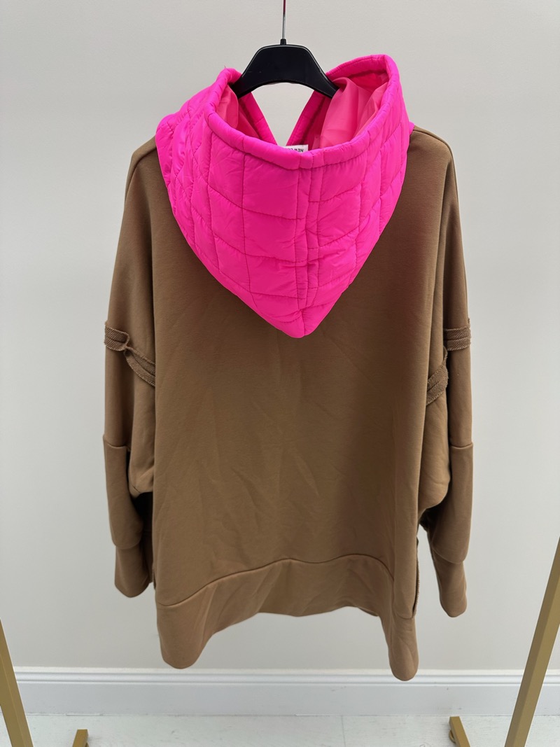 Ce sweat grande taille camel revisité affiche un look moderne et audacieux grâce à sa capuche matelassée rose fluo, qui apporte une touche de couleur vibrante à une base neutre.
