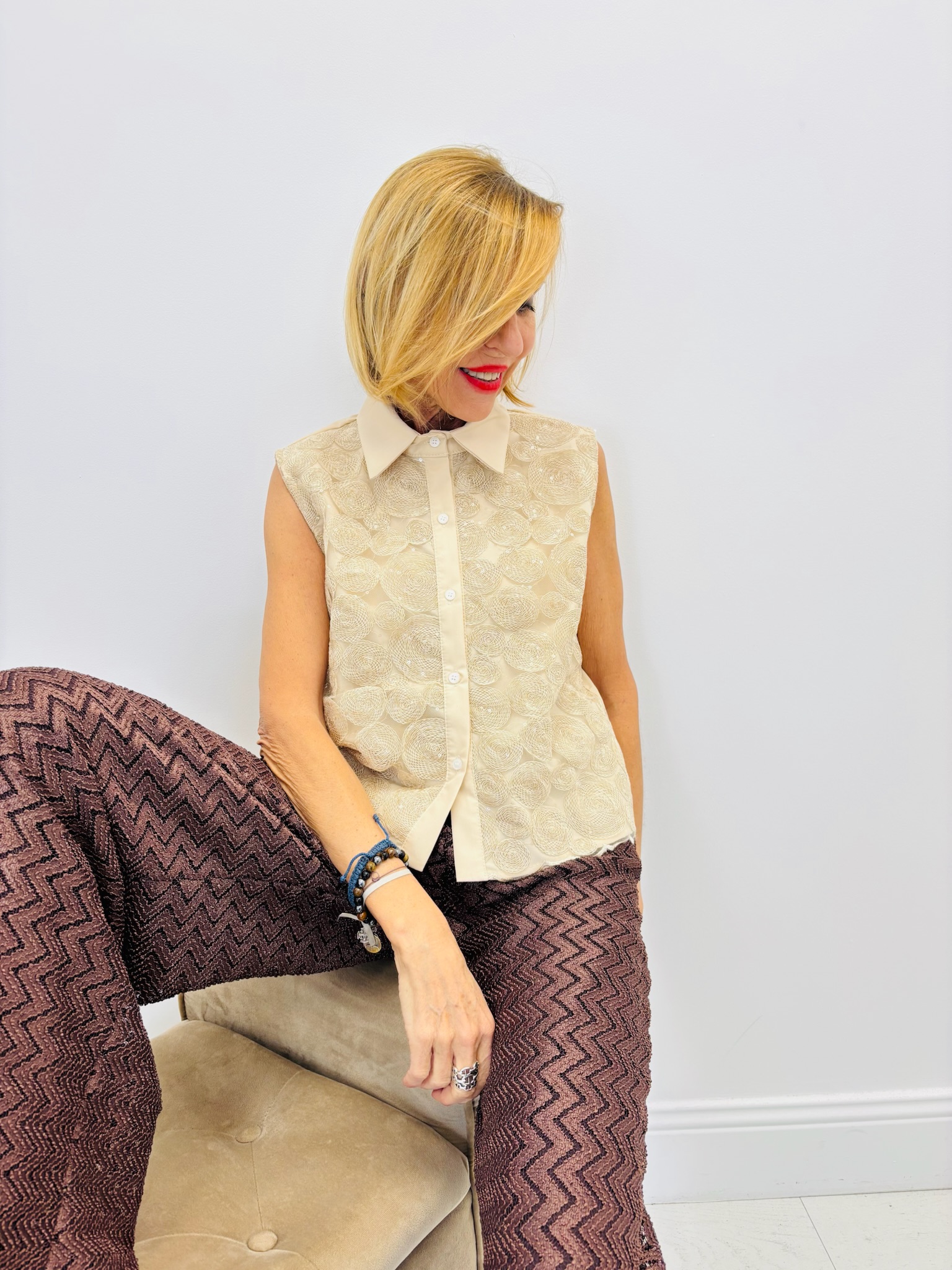 Ce top sans manches signé VOGUE est une pièce raffinée qui allie modernité et glamour. Le devant est entièrement travaillé en broderies circulaires rehaussées de sequins délicats, créant un effet lumineux subtil et très chic.