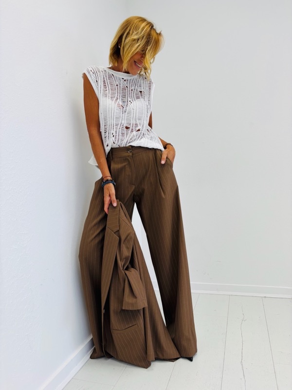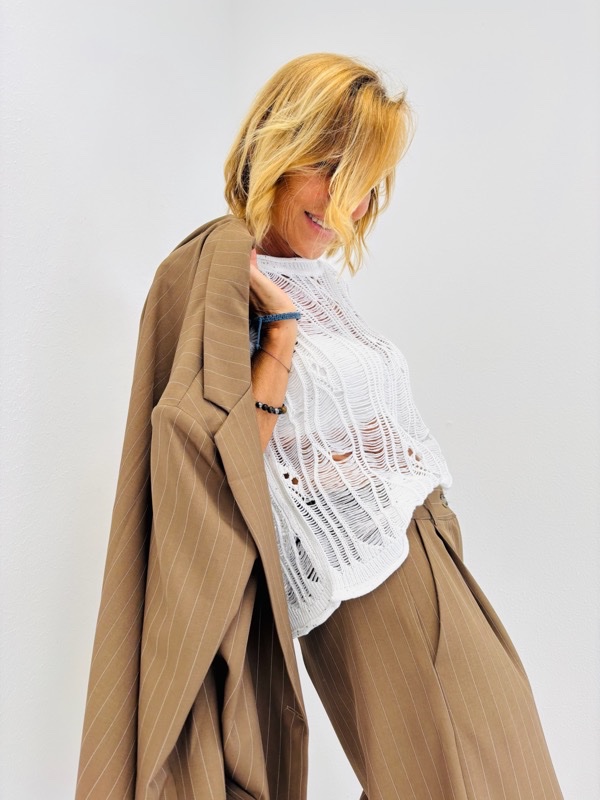 Un top original et tendance qui joue sur la transparence. Sa maille ajourée effet crochet apporte une touche moderne et légèrement bohème, parfait pour superposer sur un débardeur ou un bandeau.