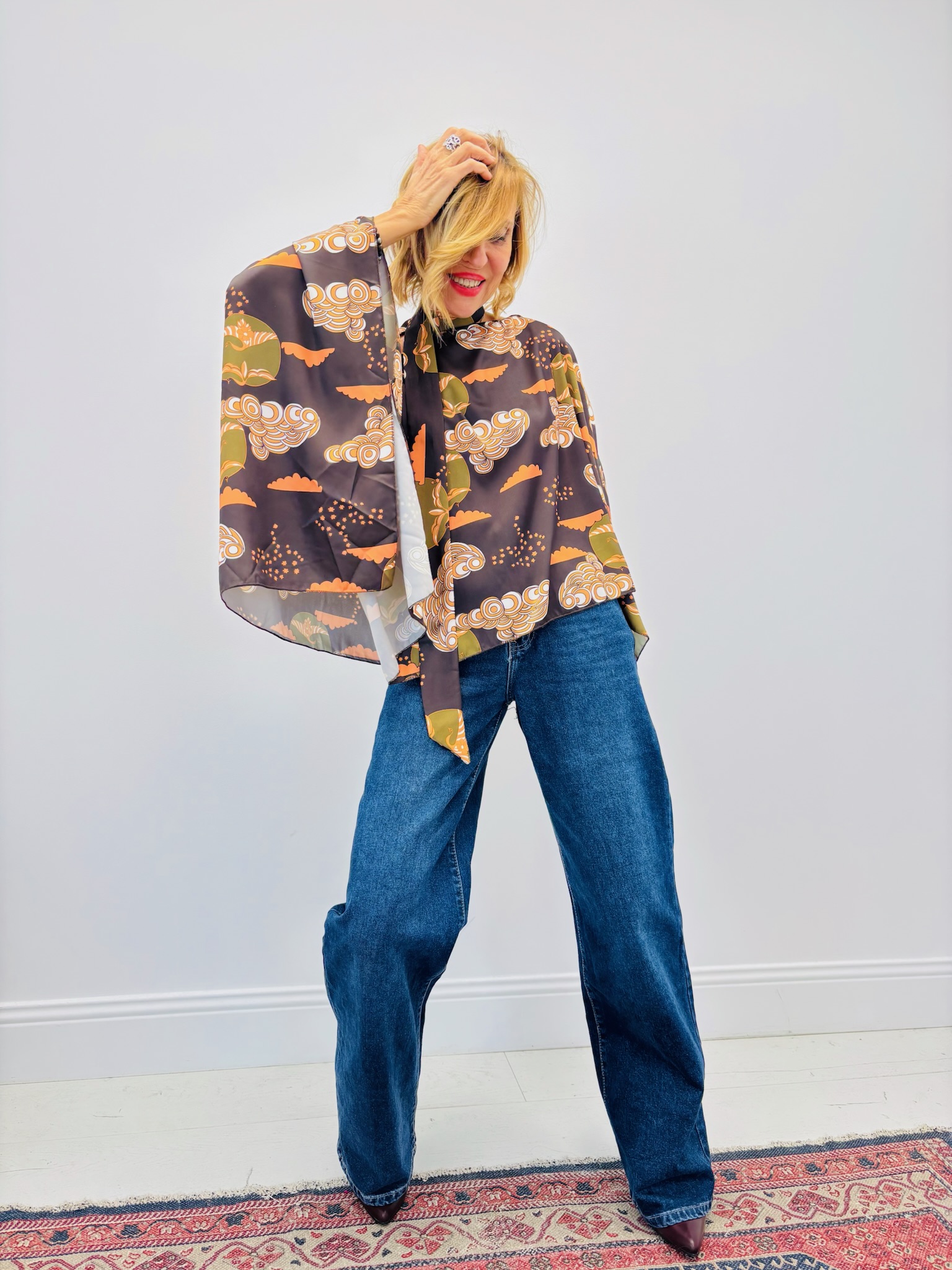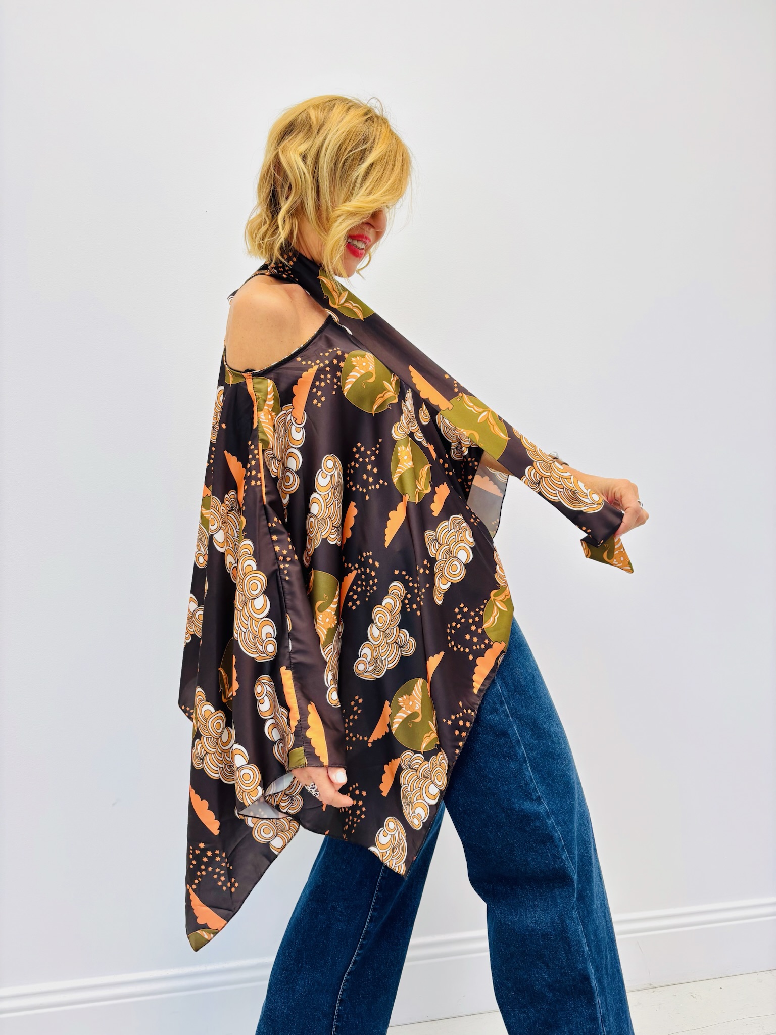 Ce top satiné séduit par son tissu soyeux et son imprimé rétro chic dans des tons chauds de marron, orange et kaki.