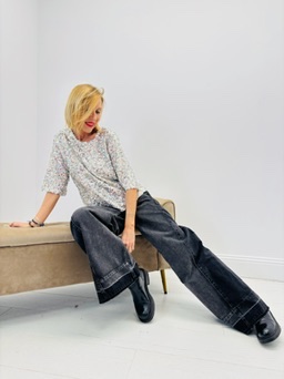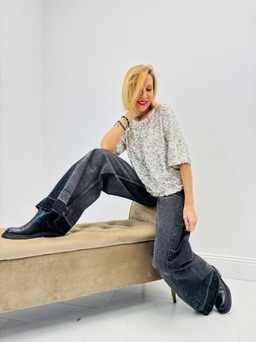 Porté ici avec un jean large noir délavé, il crée un contraste chic et moderne : la brillance des sequins s’équilibre avec la décontraction du denim.