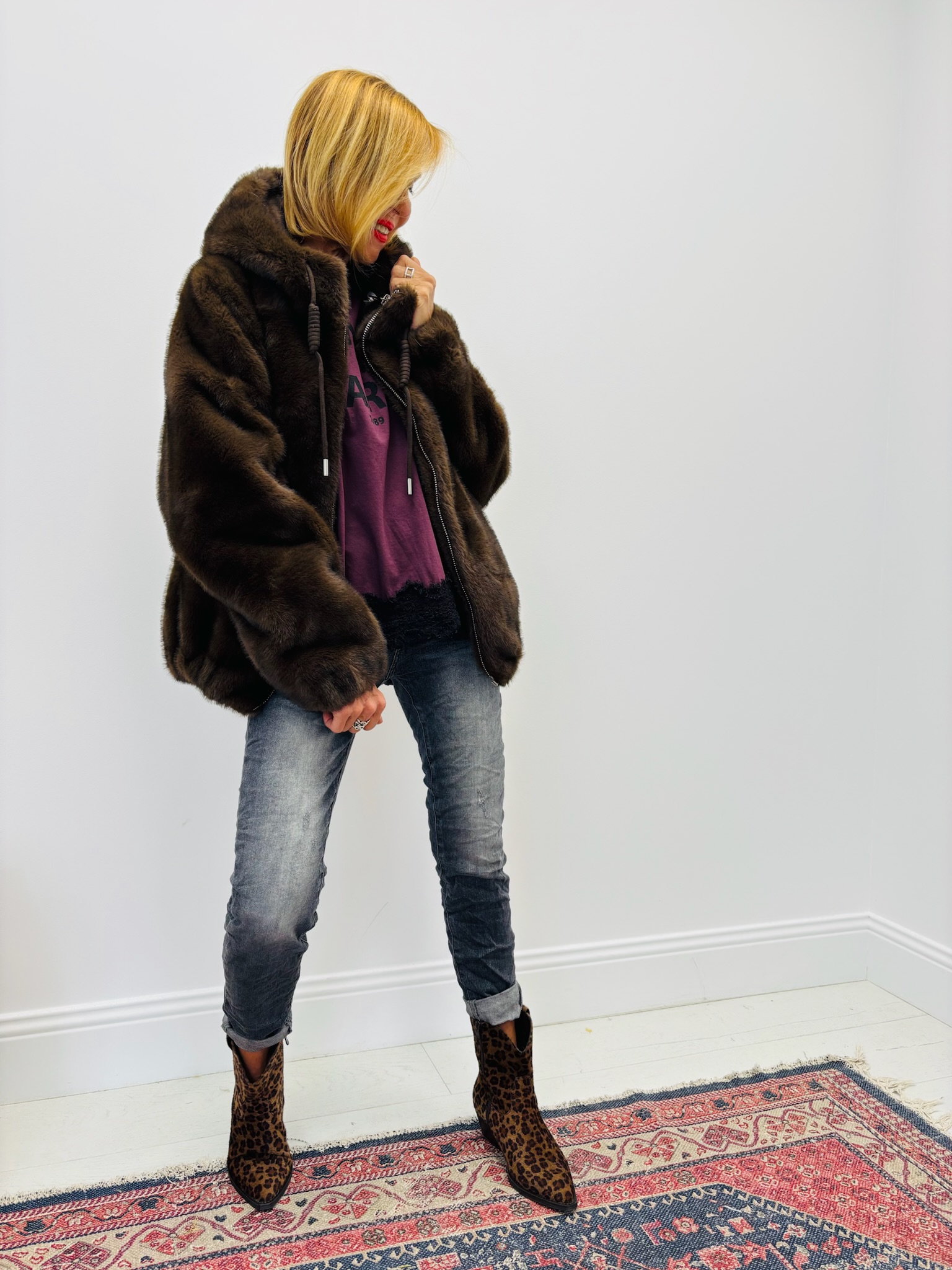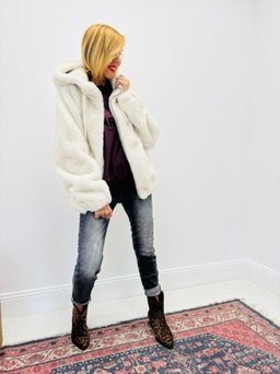 Douce, chaude et ultra tendance, cette veste à capuche en fausse fourrure est l’alliée parfaite pour affronter la saison froide avec style. Sa texture moelleuse et sa coupe oversize lui donnent un look chic et cocooning à la fois.
