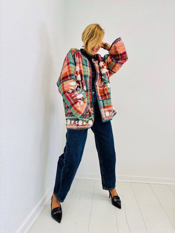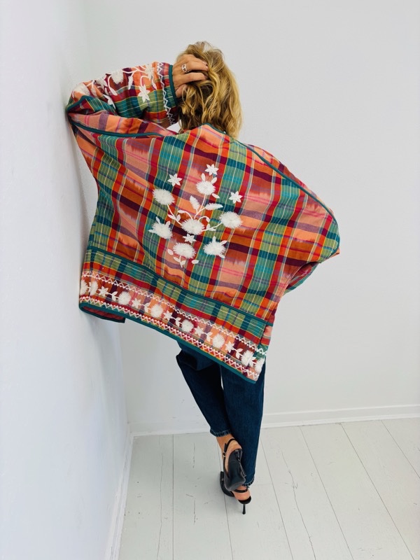 Une pièce forte et originale qui apporte immédiatement du caractère à vos tenues. Cette veste légère au motif carreaux multicolores se distingue par ses broderies florales contrastées sur le devant, les manches et le dos, qui lui confèrent une allure artisanale et raffinée.
