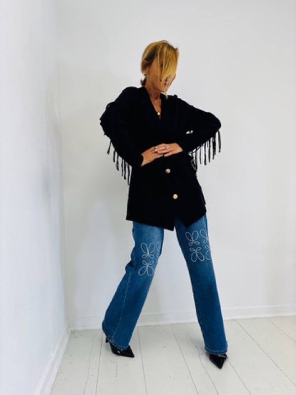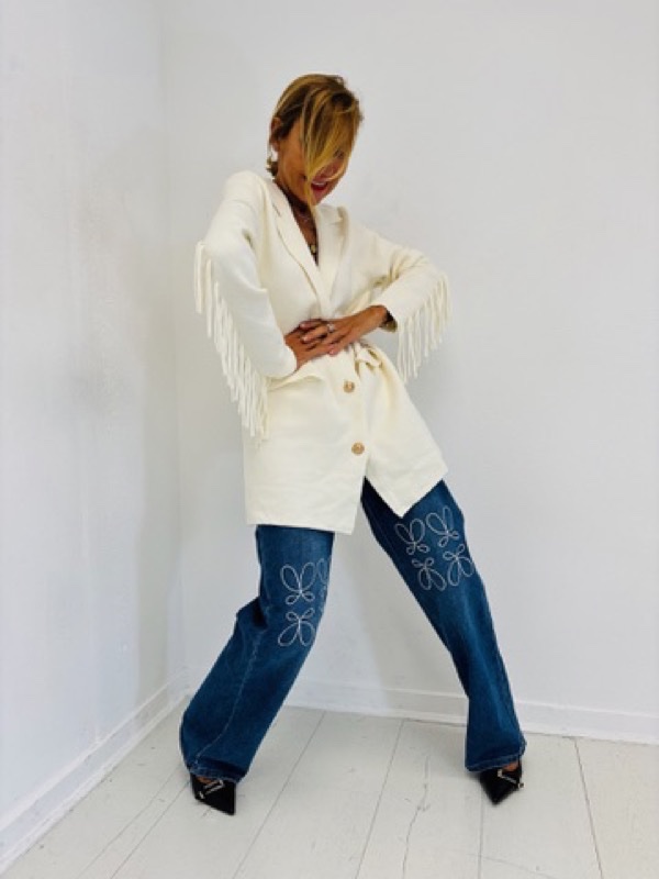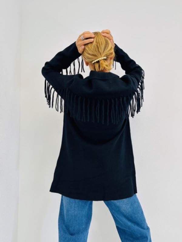 Chic devant, wild derrière ! Le gilet FELIA revisite le blazer classique avec une touche d’originalité grâce à ses franges dans le dos et sur les manches, esprit western chic. Confectionné dans une maille douce et confortable, il se porte comme une veste légère ou un cardigan stylé. Un must-have pour des looks pointus au quotidien !