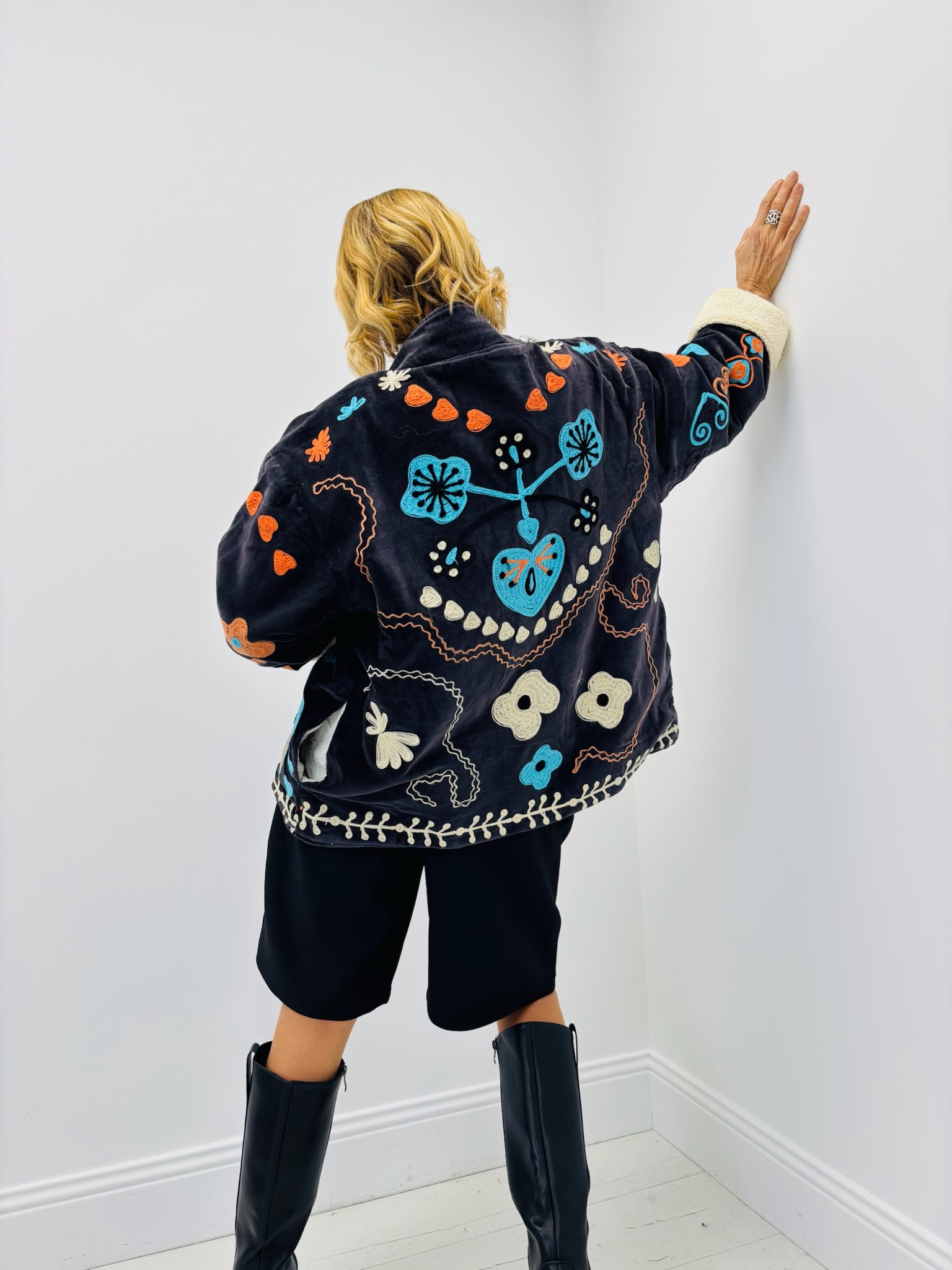 La jacket NF2912 se distingue par ses broderies colorées faites main, aux inspirations florales et folkloriques, sur une base en velours de coton doux.