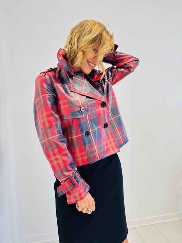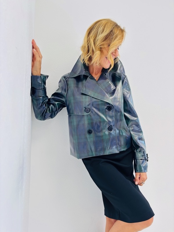 Cette veste courte en sky à carreaux signée Hippocampe est la pièce idéale pour un look moderne et audacieux. Son effet cuir verni apporte une touche sophistiquée et tendance, tout en restant légère et agréable à porter.