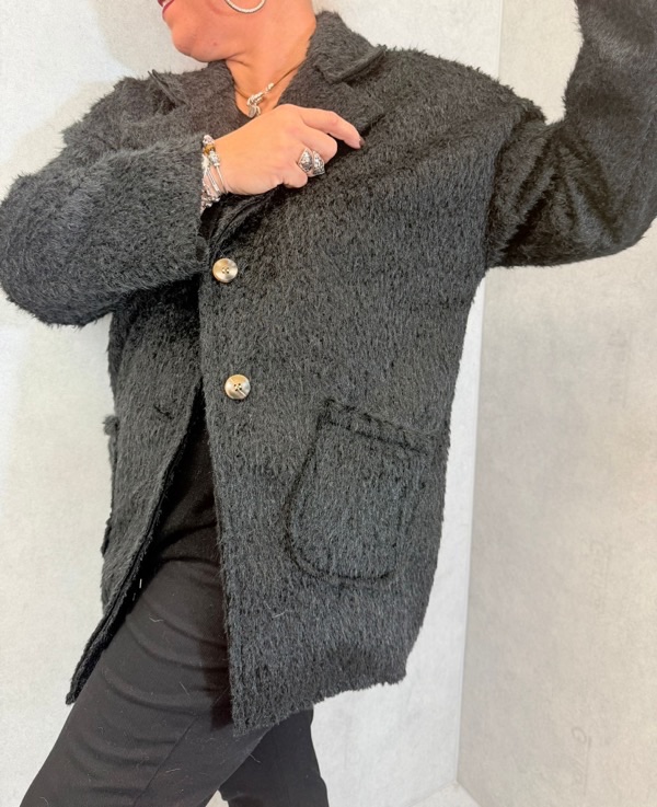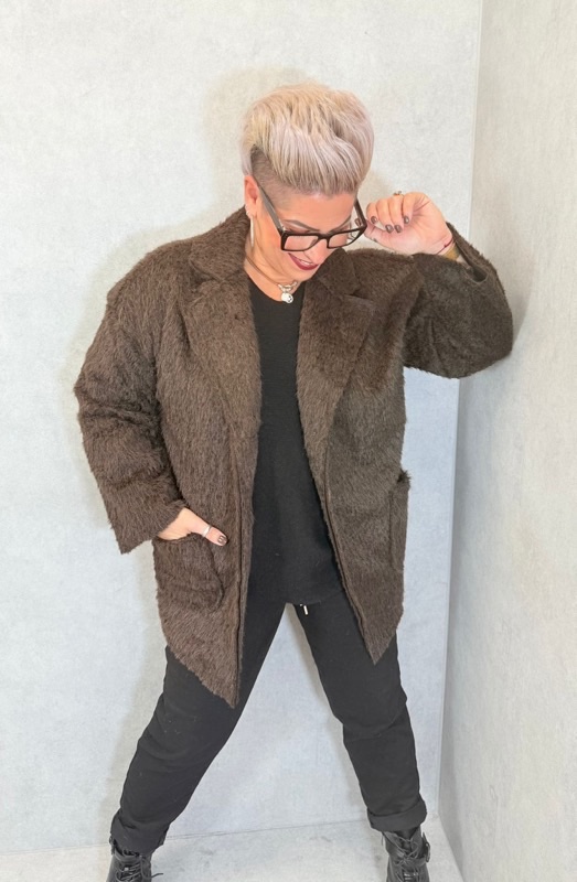 Son effet “poils longs” apporte un toucher duveteux et un volume chic, tout en gardant une belle légèreté. Sa coupe droite et ample s’adapte parfaitement aux silhouettes généreuses, pour un look à la fois cosy et élégant.