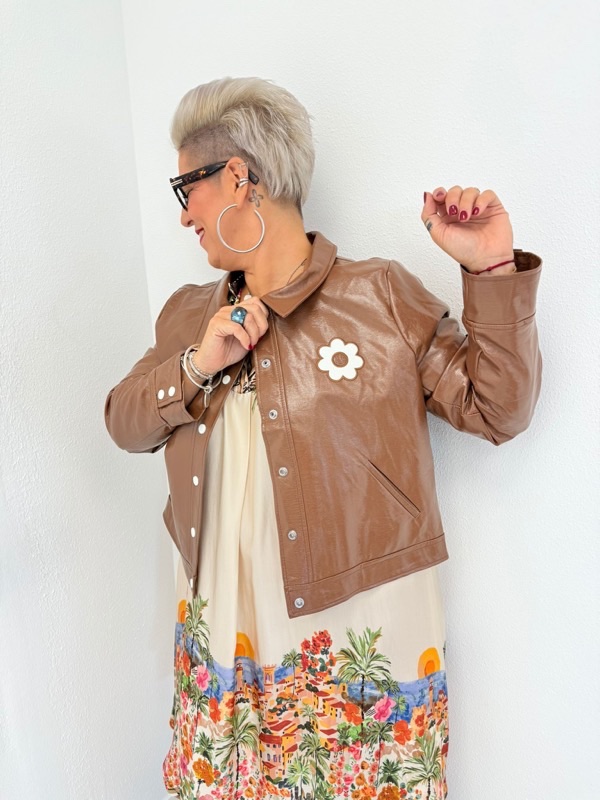 Une pièce forte et originale qui apporte une touche mode à vos tenues. À porter avec une robe imprimée comme sur la photo pour un look audacieux, ou avec un jean et un t-shirt basique pour un style casual chic.