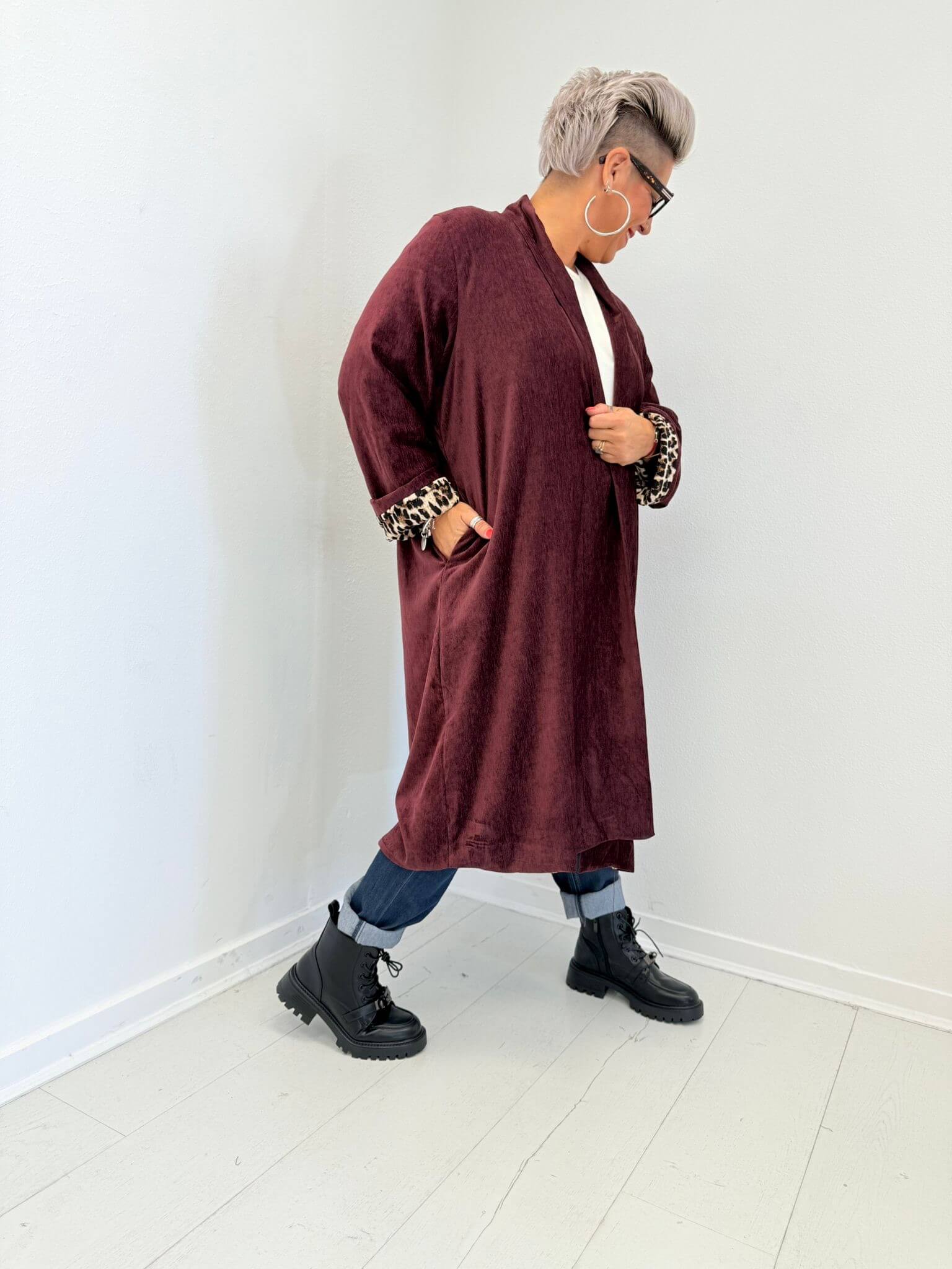 Veste longue et fluide au style moderne, pensée pour allier confort et élégance au quotidien. Sa coupe droite et ouverte met en valeur la silhouette, tandis que ses finitions contrastées apportent une touche tendance et originale. Les manches longues peuvent se retrousser pour un look plus décontracté, et sa matière légère assure un tombé naturel agréable à porter.