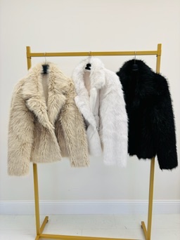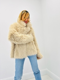 Sur les photos, la veste est portée dans ses deux versions : fausse fourrure pour un effet glamour et douillet, suédine retournée pour une allure plus urbaine et minimaliste.