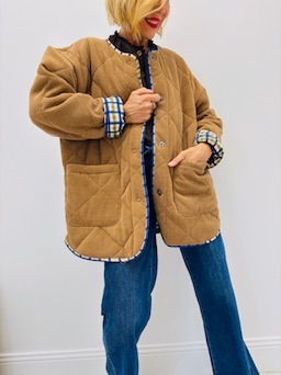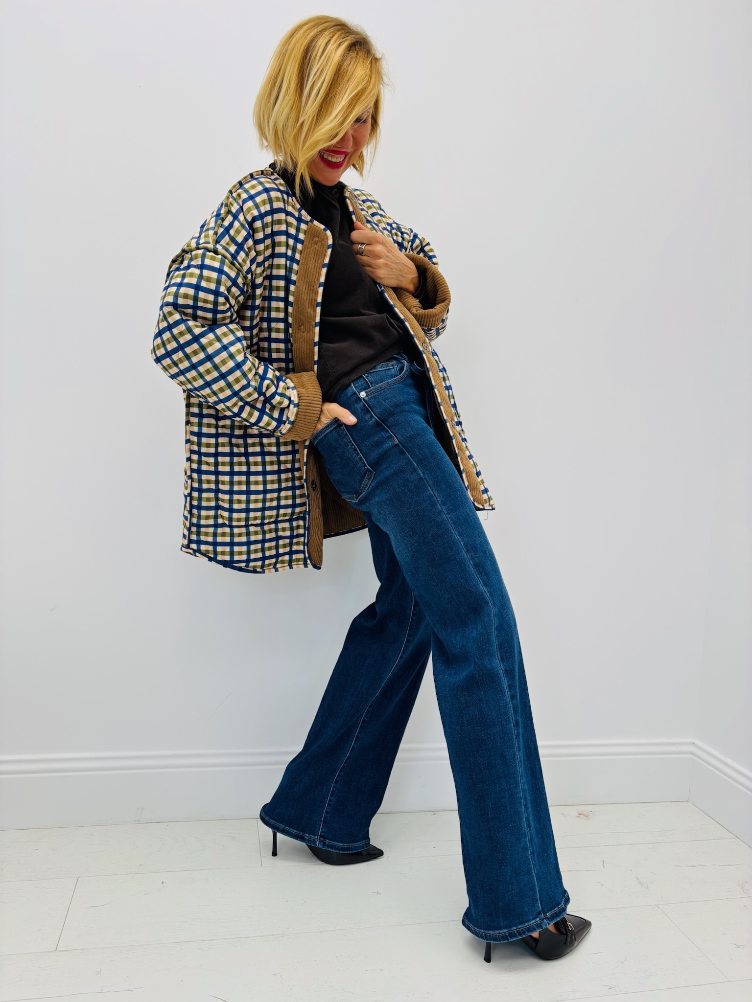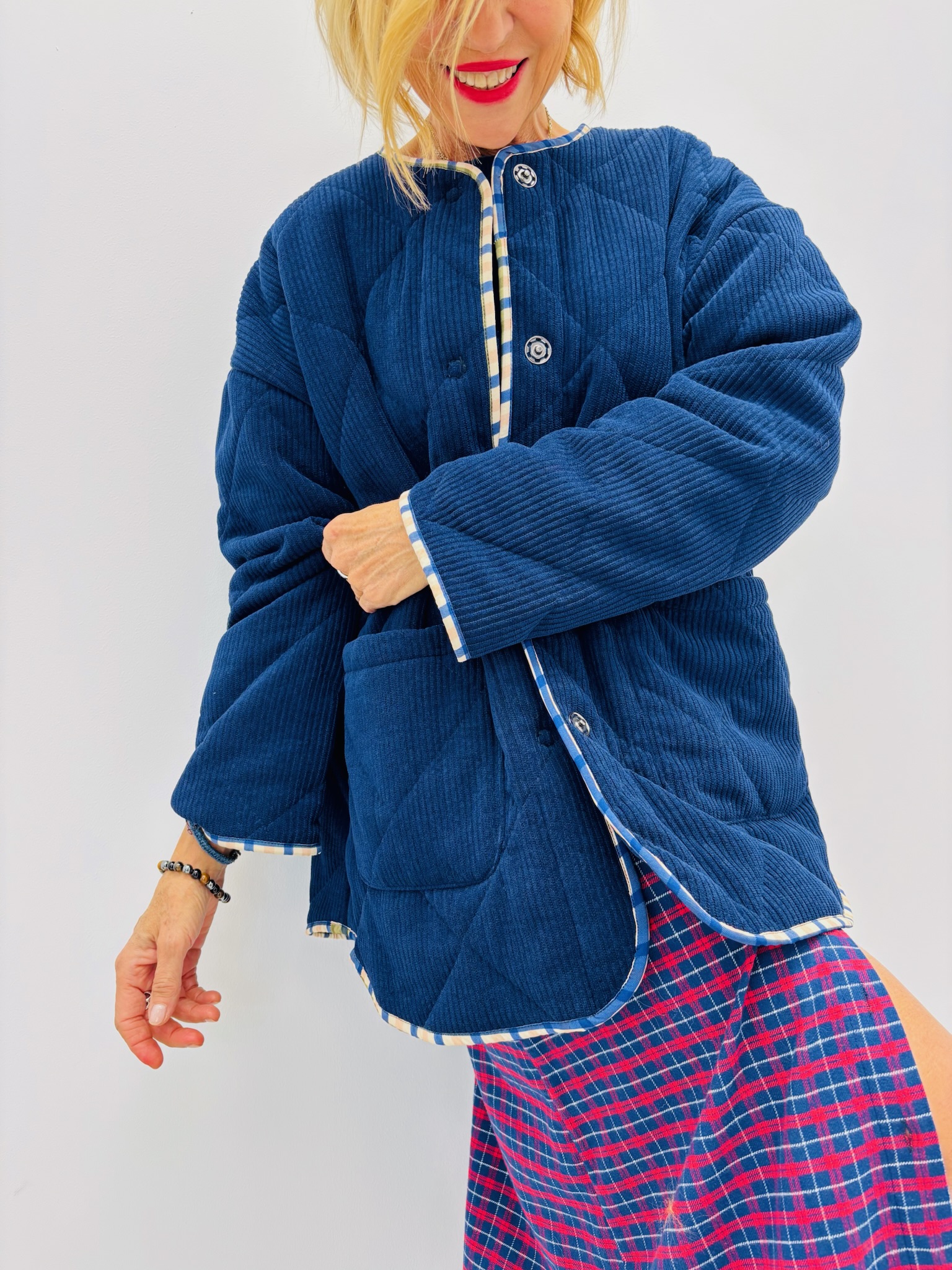 Une pièce coup de cœur qui allie confort, chaleur et style ! Cette veste réversible offre deux looks distincts : un côté en velours côtelé matelassé pour un style rétro chic, et un côté à carreaux colorés pour une touche plus décontractée.