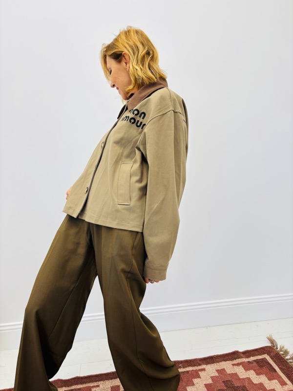 Une veste d’inspiration workwear revisitée avec élégance. Confectionnée dans une toile résistante, elle se distingue par son col en velours côtelé contrasté et son inscription brodée “mon amour” qui apporte une touche tendance et originale.