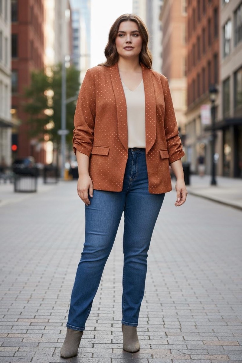 Chic et facile à porter, ce blazer fluide à imprimé pois apporte une touche élégante à toutes vos tenues. Sa coupe droite sans fermeture, ses poches plaquées et ses manches légèrement froncées lui donnent un style moderne et confortable. Idéal à associer avec un jean ou un pantalon habillé. Convient aux tailles du 44 au 50.